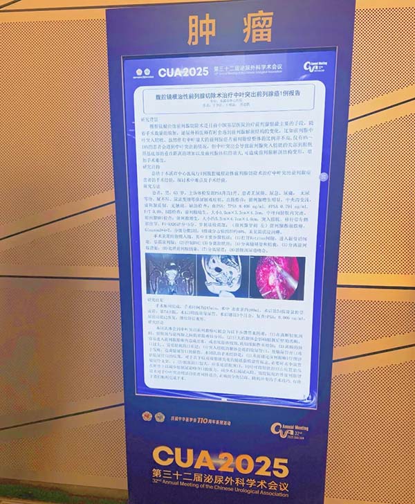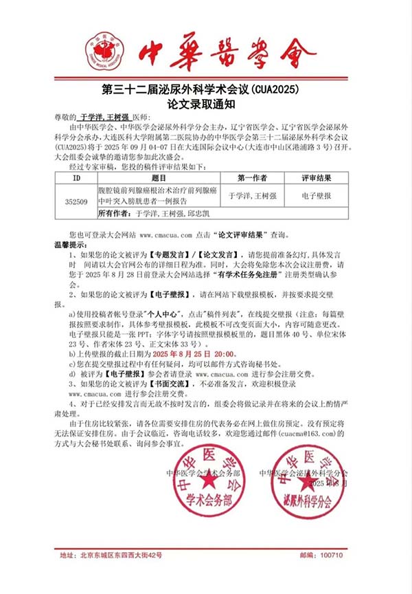 近日,中华医学会泌尿外科学分会(CUA)学术年会在大连隆重召开,本溪市中心医院泌尿外科团队表现亮眼,由科室副主任邱忠凯带队,主治医师王树强、医师于学洋共同完成的论文《腹腔镜前列腺癌根治术治疗前列腺癌中叶突出膀胱患者一例报告》,获组委会认可,并以电子壁报(e-Poster)形式在会上展示,充分展示了科室在泌尿外科领域的临床与科研水平。